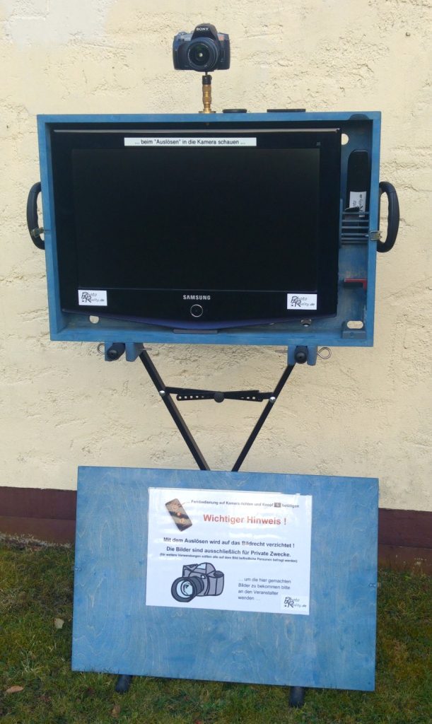 Die Selfiebox wird ca. 3-4m vor eine Wand gestellt, vor der dann die Gäste einfach die Foto-Fernbedienung in die Hand nehmen.